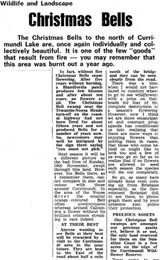 On what is left of the wildflower plain between Currimundi and Point Cartwright, there may still be seen, and wondered at, beautiful patches of our red and gold Christmas Bells. They may not be along the roadside, but by walking back from the road a distance, some will be found. These are protected wildflowers and not for the picking, despite the knowledge that the developers will finally destroy them. See them this season, take your friends and families to see them while there is still time and keep them as a precious memory or as a record on film.
