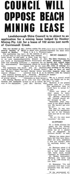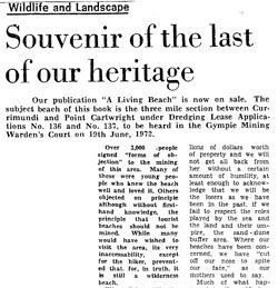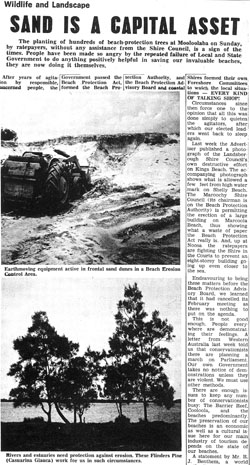 The sloping sands and adapted vegetation of coasta As early as 1946 Kathleen McArthur was protesting about the removal of the King’s Beach sandhills, long before beach protection was of public interest. This was an issue she took up in newspaper articles over many years. Attitudes she had to contend with were encapsulated in the words of a woman visitor to Caloundra who remarked that it was a great improvement not having to get out of the car on a visit to the beach. Actual and proposed destruction of frontal dunes for sand mining, roads and housing development along the Kawana coastal strip became another target for protest by Kathleen and WPSQ in the 1970s. Their concerns were vindicated in February 1972 when not one, but two, cyclones swept down on the Coast. High seas broke through dunes lowered by developers along a section of what is now Buddina, flooding the land behind and necessitating urgent work by bulldozers to construct artificial dunes. Vital to Kathle Between Currimundi and Point Cartwright there are three miles of living beach threatened by processes everyone now acknowledges to be destructive. Do we, poor in spirit and apathetic, allow this to happen? Or do we, as responsible stewards of our heritage, force our Local and State Governments to resume this area and give it protective management? Kathleen McArthur Slide Collection Lunch Hour Theatre Script With the Environment Trendy, September [n.d.] With the Environment Trendy, September [n.d.], p 1 [On the importance of beach and dune protection] The Sunshine Coast IS because of its beaches. There are beaches of golden sand, washed clean twice every 24 hours by the high tides and swept by the winds off the sea. It is our inheritance but we haven’t been very provident with our heritage––we have not only used all the interest, we have dipped into the capital far too deeply and our investment is losing its value. It is time we took stock to save what little is left. We were never taught to understand the system by our elders. Our forebears themselves did not understand, they simply repeated the mistakes made in Europe and America and in Queensland we simply copied New South Wales and Victoria, the older colonies where the precedent was set. Now, faced with the poverty of our losses, it is time we opened our own minds to the problems, endeavouring to see it for ourselves, to develop an understanding as a basis for future action, or maybe lack of action if action is out of order when passivity is required. With the Environment Trendy, September [n.d.], extracts from pp 4, 5, 6, 7 …let us look at the early use of beaches. Until quite recently, practically close up to the end of the 2nd World War, few people other than commercial fishermen actually resided permanently along the coastline. From day one the rural population had been involved in dairying, cropping, grazing and mining. One took the family to the beach for a holiday and the holidaymakers patronised the rare hotel, or the boarding house, for relaxed swimming, fishing, perhaps a game or two of tennis and much idling. The majority camped and they camped just where they chose, for the field was wide open. Some would look down on the rest from the top of the headlands, but others chose the dunes so they could walk out of their tents straight on to the tidal beach to swim, or fish, play cricket, or wash the dishes, build sand castles or gather shells. Realising the potential revenue, the LAC [Land Administration Council] or whatever the title was it bore at the time, surveyed and subdivided and sold foreshore land including that in the dune system, probably all drawn up in the mapping office where there is no indication of instability nor any information on the importance of the dune system to the protection of the tidal beach. Sitting in the survey office they couldn’t see how the Spinifex bound and cooled the sand, nor how the trees shaded the sand from the hot rays of the sun and allowed them to survive… …On Kings Beach there was a barbed-wire entanglement in case of invasion, which was great protection for the environment in keeping feet off the dunes, and so, when the war ended, the dunes had recovered their pristine condition, far better than their condition at the beginning of the war. But it was not long before the rot set in. 1945, the first Christmas of peacetime brought back the holiday crowds after five years; five years without luxuries such as beach umbrellas. That was not seen as a problem; the people simply went into the dunes and broke branches off the trees to give them shade… …In September 1946 I learnt that the Shire Council was to knock down dunes on Kings Beach to form a level area where a carnival could be held in the Christmas holidays. Horrified by the idea, I gathered up the two pre-schoolers and canvassed the Kings Beach residents to protest, which they did, and the plan was abandoned. Not to be thwarted, the progressives enticed the Shire Chairman from his farm in the hinterland to the beach where they persuaded him to support their plan. He did so and the dunes came down and the carnival went in and it rained right through the holiday period and it was a miserable failure. Little by little the dunes came down until by 1950 there was nothing left. The Lifesavers’ hut and two houses built on the foredune had to be removed. Nobody associated the lowering of the dunes with the loss of the beach. It was not in the Press. It was not in the school books. It was not heard in Parliament. Most, or at least many, people even considered it an improvement. Finally, some big seas, without any opposition, actually reached the road behind. Crisis! Roads cost money, ratepayers’ money, but even then it was not acceptable that the dunes were an essential part of the beach system. Then the very same people began advocating revetment walls. Education was what was needed… With the Environment Trendy, September [n.d.], pp 10, 11 Towards the 