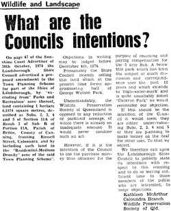 Mrs. McArthur was registering her objection to a proposal by the Landsborough Shire Council to rezone part of the western section of the park from ‘parks and recreation’ to ‘residential––medium density’.